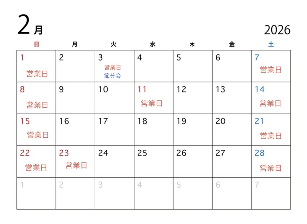 2月の営業日のお知らせです。冬本番の2月は、土・日祝日のみの営業となります。あたたかいひとときを過ごしにぜひお越しください。